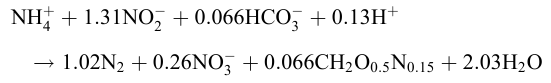 該反應(yīng)以NH4+作電子供體,NO3-或NO2-為電子受體,將水體中的氮轉(zhuǎn)變成N2。厭氧氨氧化過程是在自養(yǎng)菌作用下完成,這種自養(yǎng)菌生成速度慢,泥齡長,但產(chǎn)生的剩余污泥量較少。厭氧氨氧化總的化學(xué)計量方程式: